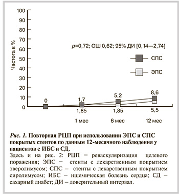 Годичные результаты чрескожного коронарного вмешательства с применением стентов, покрытых эверолимусом, у больных ишемической болезнью сердца в сочетании с сахарным диабетом достоверно не отличаются от результатов чрескожного коронарного вмешательства с использованием стентов, покрытых сиролимусом.