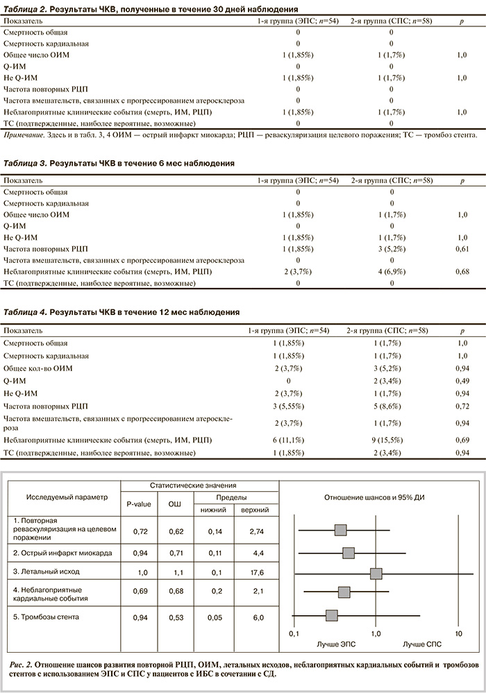 Через 30 дней наблюдения после коронарного стентирования повторных РЦП в обеих группах не потребовалось (табл. 2).