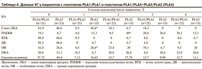 В группе пациентов с генотипом PLA1/PLA2 или PLA2/PLA2 доминировало многососудистое поражение КА. Для облегчения анализа степени стеноза в обеих группах нами был рассчитан средний процент пациентов, у которых наблюдался данный уровень стеноза (в табл. 5 — средняя величина).