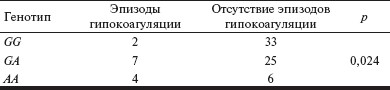 Таблица 3. Взаимосвязь развития эпизодов чрезмерной гипокоагуляции с полиморфизмом гена VKORC1 у больных группы «фармакогенетического» подхода.