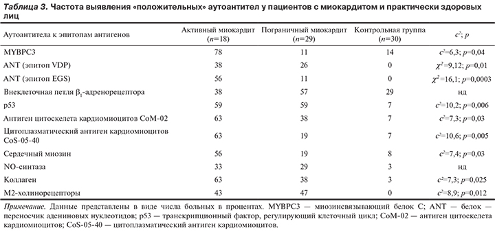 Современные представления о патогенезе воспалительных заболеваний миокарда неразрывно связаны с понятием аутоиммунитета. Дополнительным подтверждением аутоиммунной природы миокардита служат такие проявления заболевания, как персистирующая при отсутствии инфекционного агента воспалительная инфильтрация в миокарде, повышение титра циркулирующих кардиоспецифичных аутоантител (ААТ) и в ряде случаев – эффективность иммуносупресивной терапии. При иммуногистохимическом исследовании биоптатов миокарда у больных миокардитом в 59% случаев выявляются специфические ААТ [2]. Вместе с тем циркулирующие антимиокардиальные антитела не являются патогномоничным признаком миокардита и могут определяться у 9—57% больных дилатационной кардиомиопатией (ДКМП), у 9,3% пациентов с острым коронарным синдромом, у 27,6% – с систолической дисфункцией миокарда ишемического генеза и даже у 2—25% практически здоровых лиц [2—4]. Несмотря на низкую специфичность, выявление повышенного титра циркулирующих кардиоспецифических ААТ, как правило, ассоциировано с неблагоприятным прогнозом течения миокардита или ДКМП, а также с более высоким риском развития заболевания у здоровых родственников больных ДКМП [5, 6].