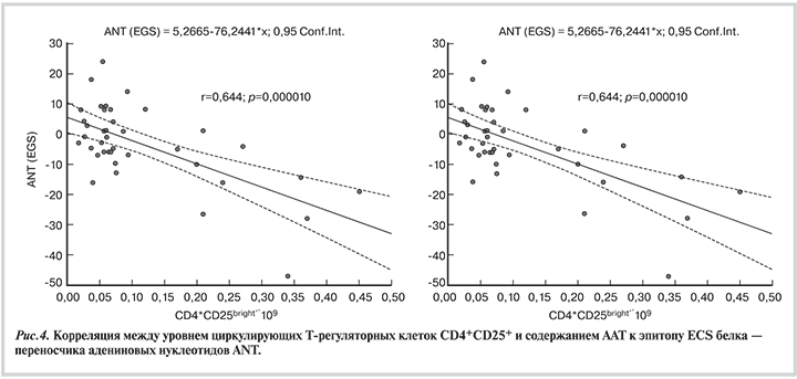 Рост популяции Т-регуляторных клеток CD4+CD25+ ассоциирован с повышением концентрации NT-proBNP, который служит маркером тяжести и прогноза у больных СН (rs=0,426; p=0,019). Наряду с этим выявлена обратная корреляция между содержанием ААТ к эпитопу ECS белка – переносчика адениновых нуклеотидов ANT, кардиоспецифичному миозину и уровнем циркулирующих Т-регуляторных клеток CD4+CD25+ (β=-0,644; p=0,00001 и rs=-0,361; p=0,026 соответственно) (рис. 4).