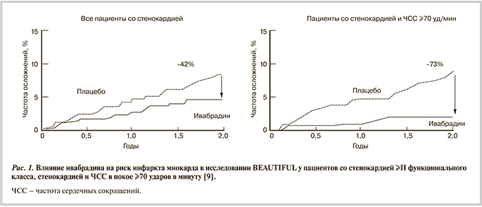 Предупреждение инфаркта миокарда (ИМ) является стратегической целью лечения больных со стабильной ИБС [7]. В рандомизированном двойном слепом плацебо-контролируемом исследовании BEAUTIFUL участвовали пациенты с ИБС и фракцией выброса (ФВ) левого желудочка (ЛЖ) менее 40% [8]. В дополнение к стандартной терапии, в 87% случаев включавшей β-адреноблокаторы, 5479 пациентов получали ивабрадин по 5—7,5 мг 2 раза в день, 5438 — плацебо. В подгруппе пациентов с ЧСС ≥70 уд/мин лечение ивабрадином снижало частоту госпитализации с фатальным и нефатальным ИМ (относительный риск — ОР 0,64 при 95% доверительном интервале — ДИ от 0,49 до 0,84; р=0,001) и коронарной реваскуляризации (ОР 0,70 при 95% ДИ от 0,52 до 0,93; р=0,016). Более того, у пациентов со стенокардией ≥II функционального класса по классификации Канадского сердечно-сосудистого общества ивабрадин снижал суммарный риск событий первичной конечной точки (сердечно-сосудистая смерть, госпитализация с фатальным и нефатальным ИМ или сердечная недостаточность) на 24% (ОР 0,76 при 95% ДИ от 0,58 до 1,00) и госпитализации с ИМ — на 42% (ОР 0,58 при 95% ДИ от 0,37 до 0,92). У пациентов с ЧСС ≥70 уд/мин отмечалось снижение частоты госпитализации с ИМ на 73% (ОР 0,27 при 95% ДИ от 0,11 до 0,66) и коронарной реваскуляризации на 59% (ОР 0,41 при 95% ДИ от 0,17 до 0,99) [9] (рис. 1). Механизм указанного явления не был точно установлен.