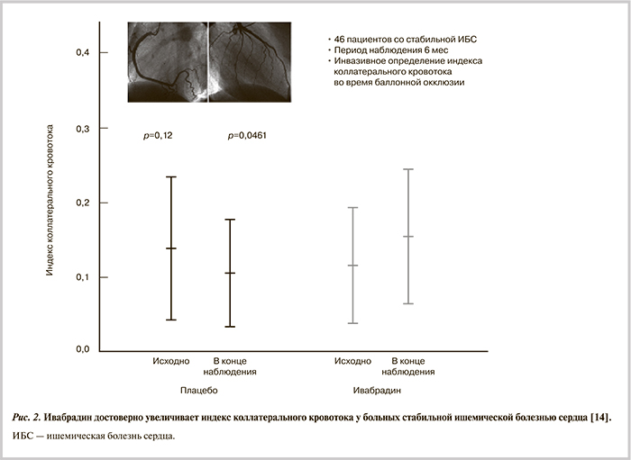 Известно, что большой размер ИМ отрицательно влияет на прогноз у пациентов, а уменьшение зоны некроза может достигаться не только путем сокращения времени коронарной окклюзии, но и с помощью стимуляции коллатерального кровотока в миокарде [13]. Касательное напряжение сдвига является основным триггером роста коллатералей и модулируется продлением диастолы. S. Gloekler и соавт. [14] проверили гипотезу о том, что ивабрадин, селективно урежающий ритм сердца, способен значительно усилить функцию коронарных коллатералей. Пациентам со стабильной формой ИБС, получающим стандартную терапию, дополнительно назначали ивабрадин (от 2,5 до 7,5 мг 2 раза в сутки для достижения ЧСС 60 уд/мин в покое) или плацебо. В течение 6 мес терапии средняя ЧСС в покое в группе ивабрадина оказалась существенно меньше, чем в контрольной группе (р=0,0089). Пациенты подвергались инвазивному исследованию в динамике с определением индекса коллатерального кровотока во время баллонной окклюзии артерии. В группе плацебо индекс коронарного кровотока имел тенденцию к снижению с 0,140±0,097 в исходном состоянии до 0,109±0,067 к концу контролируемой терапии (p=0,12), тогда как под действием ивабрадина он увеличивался с 0,107±0,077 до 0,152±0,090 (p=0,0461) (рис. 2). В результате разнонаправленной динамики изменений индекса коллатерального кровотока через 6 мес в группе плацебо (−0,031±0,090) и ивабрадина (+0,040±0,094) различие средних значений показателя оказалось статистически значимым (p=0,0113). Авторы работы полагают, что снижение ЧСС с помощью ивабрадина положительно влияет на функцию коронарных коллатералей у пациентов со стабильной ИБС. Примечательно, что ранее этим же исследователям не удалось показать, что урежение ЧСС с помощью β-адреноблокаторов повышает индекс коллатерального кровотока [15]. Такой результат объяснили вазоконстрикторным эффектом β-адреноблокаторов.