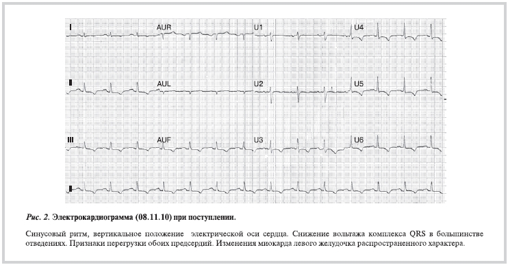 На электрокардиограмме (ЭКГ) при поступлении синусовый ритм, снижение вольтажа комплекса QRS в большинстве отведений, признаки перегрузки обоих предсердий, изменения миокарда распространенного характера в виде инверсии зубцов Т в большинстве отведений (рис. 2). ЭКГ с похожими изменениями была зарегистрирована у больного при первом обращении в поликлинику в 2007 г., еще до автомобильной травмы.