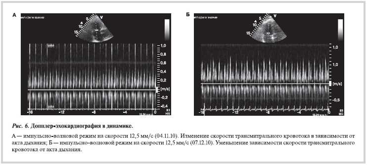 07.12.10 больному проведена повторная ЭхоКГ, при которой отмечались улучшение сократимости ЛЖ (увеличение ФВ ЛЖ с 60 до 65%) с увеличением амплитуды движения его стенок, отсутствие признаков сдавления камер и уменьшение признаков перегрузки правых отделов сердца. Нормализовалось движение межжелудочковой перегородки, уменьшились размеры правого предсердия (рис. 5, б, см. цветную вклейку).