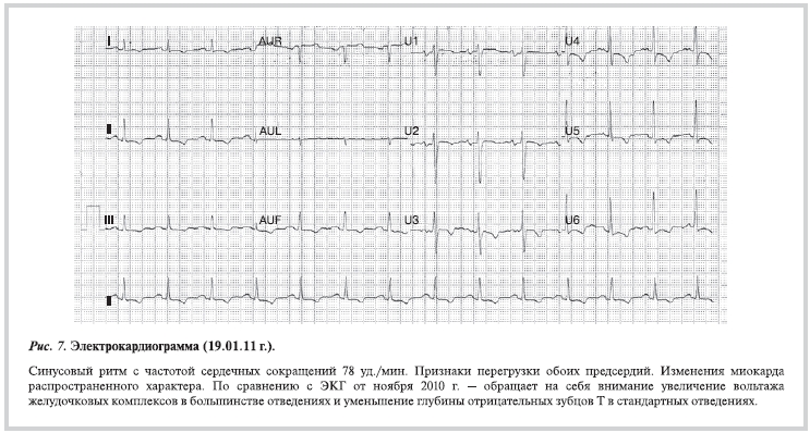 На ЭКГ от 19.01.11 сохранялись признаки перегрузки обоих предсердий. Изменения миокарда распространенного характера (рис. 7). При сравнении с ЭКГ от ноября 2010 г. обращает внимание увеличение вольтажа желудочковых комплексов в большинстве отведениях и уменьшение глубины отрицательных зубцов Т в стандартных отведениях.
