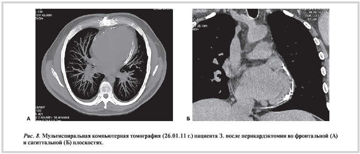 Констриктивный перикардит — редкое и крайне тяжелое заболевание, обусловливающее необходимость быстрой верификации диагноза и своевременного хирургического лечения. Поэтому в клинической практике наибольшие трудности встречаются при дифференциальной диагностике данной патологии [4]. Так, в нашем наблюдении ведущей жалобой пациента была одышка. Поскольку этот симптом в сочетании с клинико-анамнестическими данными не укладывался в клиническую картину часто встречающихся заболеваний сердечно-сосудистой системы, органов дыхания и другой патологии, это позволило предположить наличие у нашего пациента констриктивного перикардита. Использование эхокардиографии в данном случае как наиболее простого и эффективного метода позволило выявить признаки констрикции перикарда и своевременно направить пациента на хирургическое лечение. Следует отметить, что эхокардиографические признаки констрикции перикарда не являются патогномоничными и могут также встречаться при других заболеваниях сердца. Поэтому пациенту с целью подтверждения диагноза была выполнена мультиспиральная компьютерная томография, которая позволила отчетливо визуализировать утолщение и кальцификацию листков перикарда, а также выпот в полость перикарда. Таким образом, только правильная оценка клиницистом данных анамнеза, жалоб и объективного статуса в совокупности с результатами дополнительных исследований, подтвержденными данными мультиспиральной компьютерной томографии, которая может являться приоритетным методом, позволили своевременно поставить пациенту правильный диагноз и направить на хирургическое лечение.