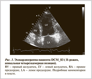 Как правило, генетически детерминированные формы ДКМП характеризуются неуклонно прогрессирующим течением и неблагоприятным прогнозом, ограниченной эффективностью кардиотропной и антиаритмической терапии [11]. Поэтому стабильность сократительной способности и ФВ ЛЖ за истекшие 6 лет (53—55% за период с 2007 по 2013 г.) выделяют этот клинический случай из ряда других наследственных форм ДКМП, которые наблюдались в нашем центре.