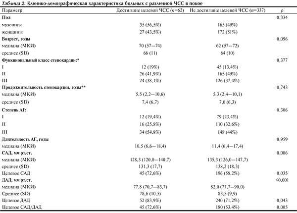 ФК стенокардии определяли согласно классификации Канадской ассоциации кардиологов [5]. Подсчет ЧСС проводили за 60 с в положении пациента сидя после 5 мин отдыха трехкратно с интервалом между измерениями 2—3 мин. Учитывали среднее значение 3 измерений ЧСС. Целевой считали ЧСС 55—60 уд/мин (включительно) или меньше, при условии, что брадикардия не вызывает неприятных ощущений и атриовентрикулярной блокады [5, 6]. АД измеряли в положении пациента сидя после 5 мин отдыха трехкратно с интервалом между измерениями 2—3 мин. Учитывали среднее значение 3 измерений АД. Степень АГ оценивали в соответствии с европейскими и российскими рекомендациями [13, 14] по максимальным уровням АД, когда-либо имевшимся у больного.
