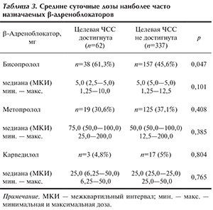 Средние суточные дозы наиболее часто используемых β-адреноблокаторов (метопролол, бисопролол, карведилол) в группах пациентов, достигших и не достигших целевой частоты сердечных сокращений, различаются недостоверно.