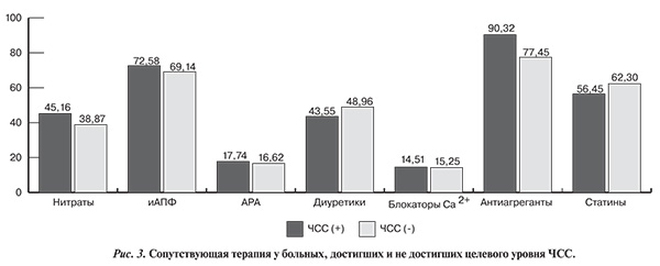 Сравниваемые подгруппы были сопоставимы и по сопутствующей терапии (рис. 3). Различия по частоте применения препаратов основных групп, таких как нитраты (28; 45,16% против 131; 38,87%), ингибиторы АПФ (45; 72,58% против 233; 69,14%), АРА (11; 17,74% против 56; 16,62%), диуретики (27; 43,55% против 165; 48,96%), антиагреганты (56; 90,32% против 261; 77,45%), блокаторы кальциевых каналов (9; 14,52% против 48; 14,24%), статины (35; 56,45% против 210; 62,31%) оказались статистически незначимыми. Вместе с тем потребность в короткодействующих нитратах в подгруппе пациентов, не достигших целевой ЧСС, оказалась достоверно выше, чем в подгруппе сравнения — 6 (1,50%) и 12 (3,01%) соответственно (р=0,045).