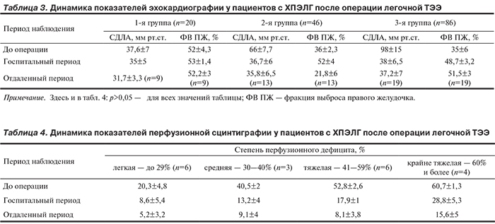 Таким образом, проведенный нами сравнительный анализ клинико-функциональных показателей, данных ЭхоКГ и перфузионной сцинтиграфии легких в отдаленном периоде показал, что операция легочной ТЭЭ приводит к снижению легочной гипертензии и предотвращает прогрессирование правожелудочковой недостаточности, что в итоге улучшает функциональное состояние пациентов и качество жизни.
