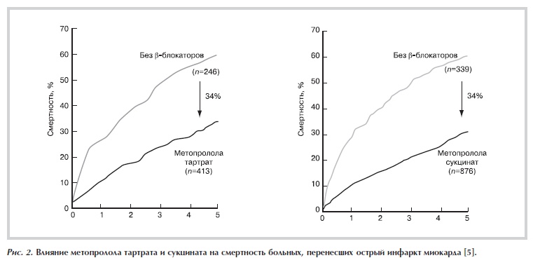 Рисунок 2. Влияние метопролола тартрата и сукцината на смертность больных, перенесших острый инфаркт миокарда [5].