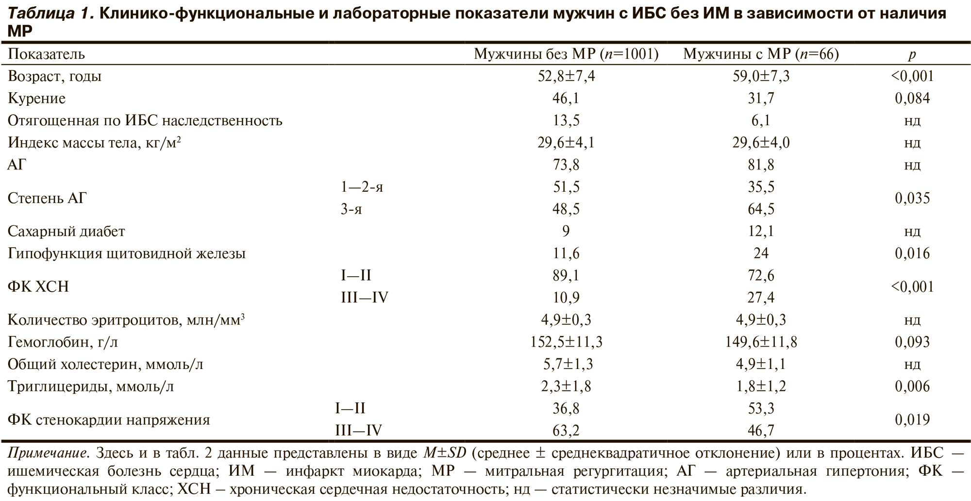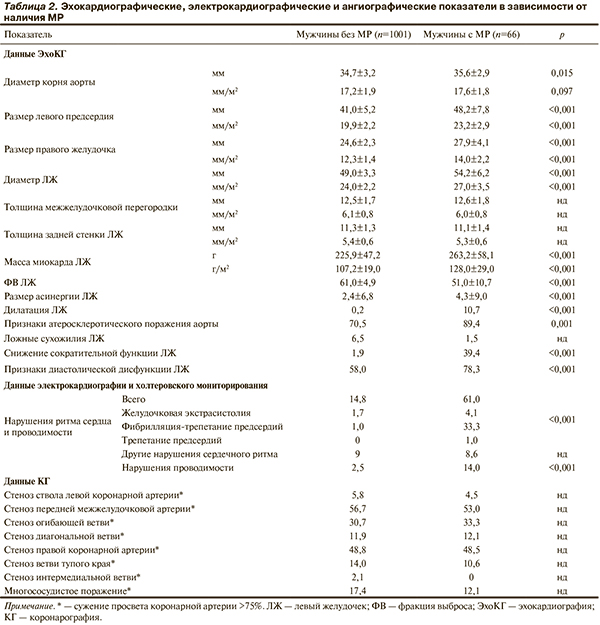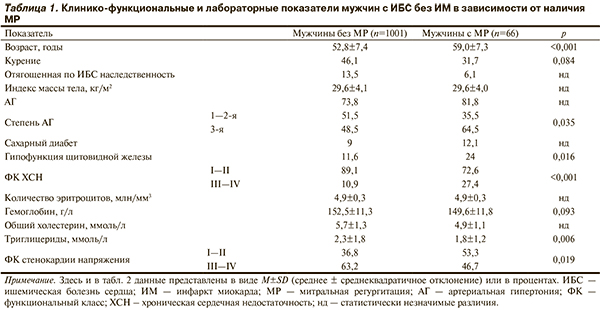 Пациенты с МР были достоверно старше, среди них реже встречались курящие (табл. 1). По индексу массы тела, частоте отягощенной наследственности по ИБС, сахарного диабета и частоте артериальной гипертонии (АГ) группы не различались, однако тяжелая АГ (3-й степени) чаще встречалась у мужчин с МР. В этой группе чаще выявляли хроническую сердечную недостаточность (ХСН) более тяжелых (III—IV) функциональных классов (ФК) по классификации Нью-Йоркской ассоциации сердца (NYHA) при более редких тяжелых (III—IV) ФК стенокардии напряжения по классификации Канадской ассоциации кардиологов. Уровни гемоглобина и триглицеридов у пациентов с МР были ниже, гипофункцию щитовидной железы у них выявляли чаще.