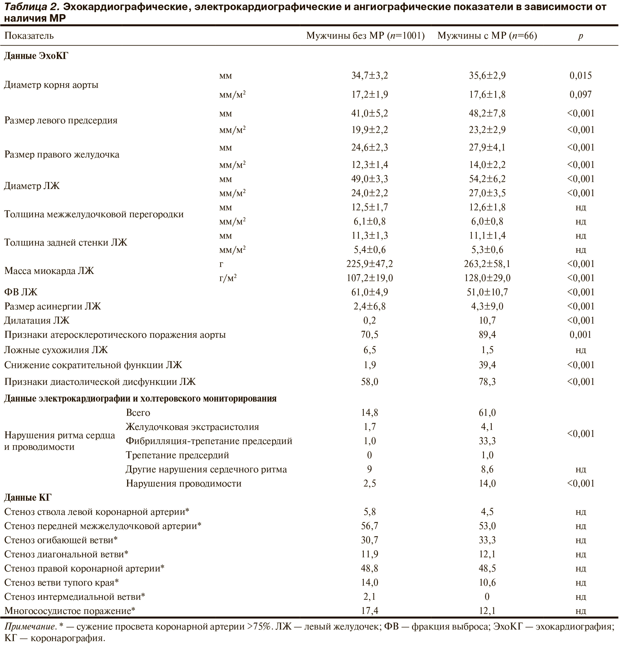 При анализе параметров ЭхоКГ (табл. 2) у пациентов с МР индексы линейных размеров полостей сердца и размер асинергии ЛЖ были больше, средняя ФВ ЛЖ — ниже, а нарушения систолической и диастолической функций ЛЖ, ритма сердца, дилатация ЛЖ и признаки атеросклеротического поражения аорты встречались чаще, чем в отсутствие МР. При достоверно не различающейся толщине стенок ЛЖ индекс массы миокарда у пациентов с МР был выше, чем у мужчин без МР. МР II степени отмечалась у 97% больных с МР, III степени — у 3%. По частоте выявления ложных сухожилий ЛЖ группы не различались.