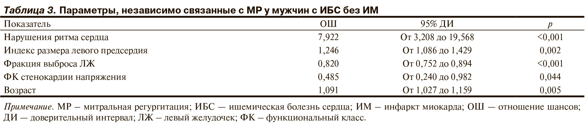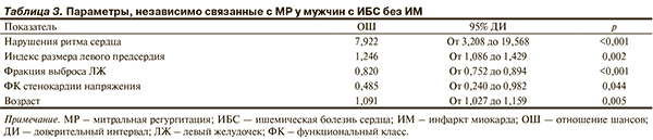 По результатам многофакторного анализа независимую связь с МР продемонстрировали нарушения ритма сердца, увеличение индекса размера ЛП, более низкие ФВ ЛЖ и класс стенокардии напряжения, а также более старший возраст (табл. 3).