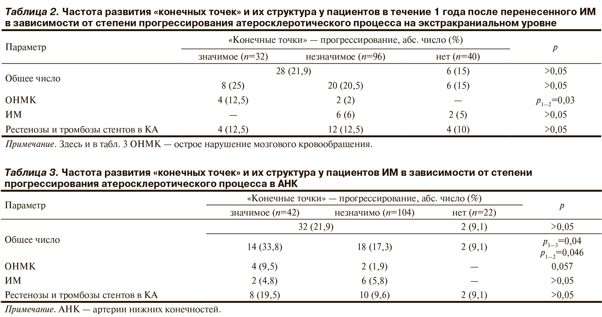 В табл. 2 представлена частота развития «конечных точек» у пациентов с ИМ в зависимости от степени прогрессирования атеросклероза в БЦА. Наибольшее количество осложнений зарегистрировано у пациентов с прогрессированием атеросклеротического процесса. Необходимо указать, что только в группах с прогрессированием атеросклероза на экстракраниальном уровне зафиксированы случаи ОНМК. В группе со значимым прогрессированием ОНМК встречалось достоверно чаще, чем в группе с менее выраженным прогрессированием. ИМ за период наблюдения развился у пациентов, вошедших в группы с умеренным прогрессированием и его отсутствием. Рестенозы и тромбозы в месте стентирования КА отмечались во всех анализируемых группах. В группах больных с прогрессированием атеросклеротического процесса в БЦА рестенозы в КА диагностированы чаще, однако статистически значимых различий между группами не отмечено.