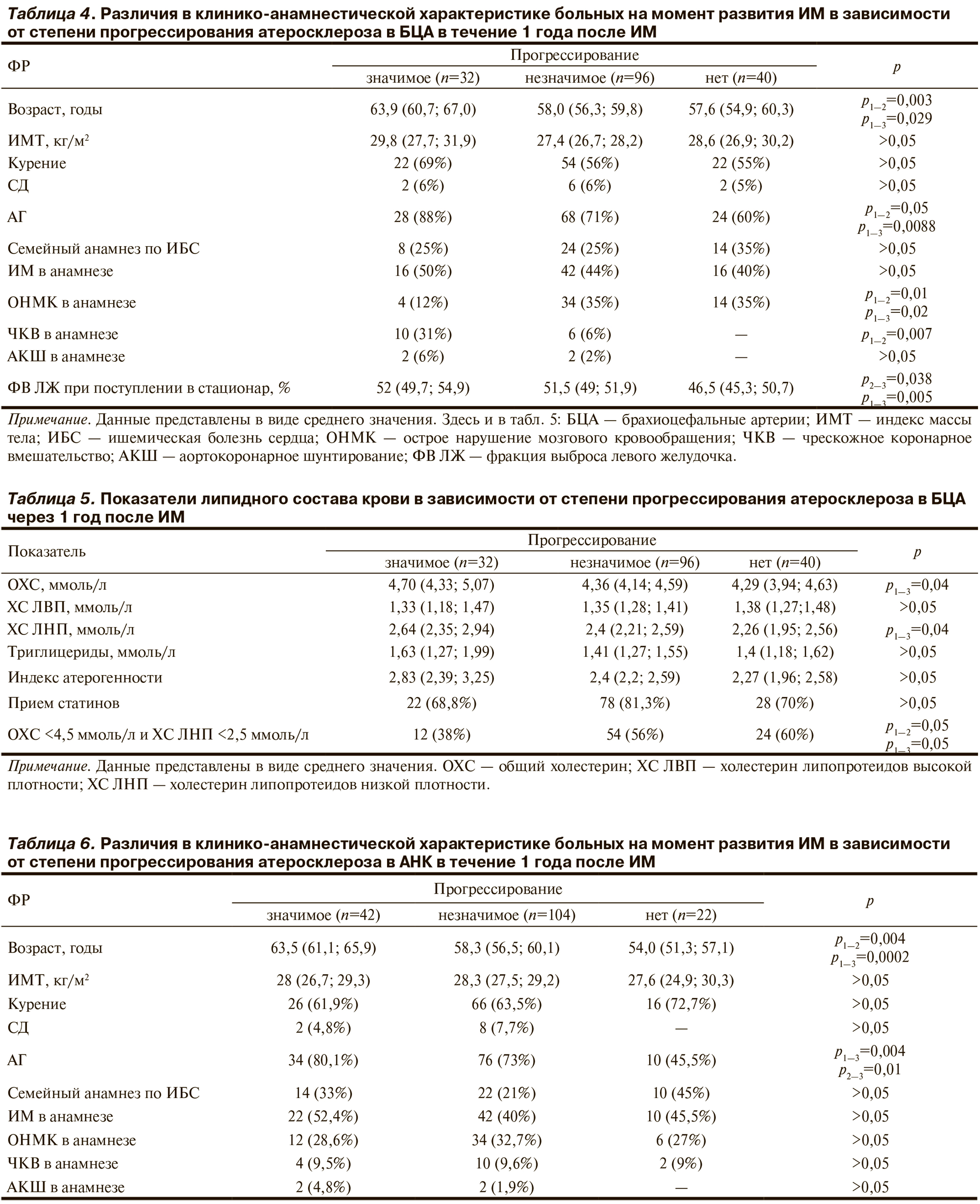 При анализе частоты развития «конечных точек» у больных ИМ в зависимости от степени прогрессирования атеросклероза в БЦА установлено, что наибольшее число осложнений развивается у пациентов с прогрессированием атеросклеротического процесса. Необходимо указать, что только в группах с прогрессированием атеросклероза на экстракраниальном уровне зафиксированы случаи развития ОНМК. В группе со значимым прогрессированием эпизоды ОНМК встречались достоверно чаще, чем в группе с менее выраженным прогрессированием. Вместе с тем ИМ за период наблюдения развился у пациентов, вошедших как в группы с умеренным прогрессированием, так и без него.
