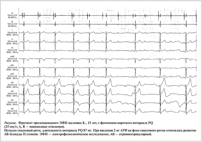 Для исключения связи короткого интервала PQ с антероградным проведением АВ-возбуждения по дополнительным проводящим путям 13 (4 девочкам и 9 мальчикам) детям была проведена медикаментозная проба с внутривенным введением АТФ. На фоне введения АТФ у всех детей наблюдалось развитие транзиторной АВ-блокады I—III степени, что исключает наличие дополнительных проводящих путей, которые могли обусловливать укорочение интервала PQ за счет шунтирования области АВУ в антероградном направлении. У 8 детей наблюдалась транзиторная АВ-блокада II степени (см. рисунок).