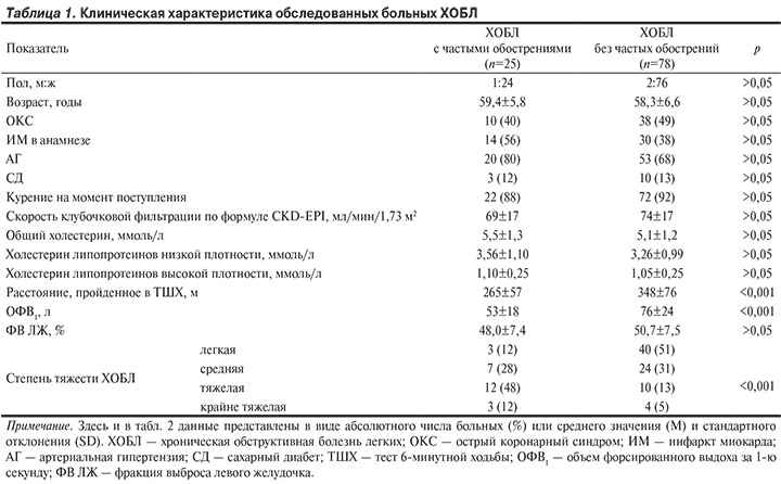 В проспективное исследование были включены 103 больных с сочетанием ИБС и ХОБЛ, которым в 2012—2013 гг. выполнено ЧКВ с имплантацией стентов. Большинство больных были включены в исследование в Центре грудной хирургии Краевой клинической больницы №1 г. Краснодара. Критерии включения: возраст 40 лет и старше; курение на момент поступления либо прекращение курения не более чем за 1 год до момента госпитализации; анамнез курения ≥10 пачка-лет; наличие ИБС — стабильной стенокардии напряжения либо острого коронарного синдрома (ОКС) с окончательным диагнозом «инфаркт миокарда — ИМ» или «нестабильная стенокардия»; имплантация одного коронарного стента или более (голометаллических либо с лекарственным покрытием) с полным восстановлением кровотока в инфаркт-связанной артерии без ангиографических признаков остаточного стеноза, диссекции или дистальной эмболизации; ХОБЛ, диагностированная в соответствии со спирографическими критериями GOLD (2011), согласно которым постбронходилатационное значение ОФВ1, отнесенное к величине форсированной жизненной емкости легких, должно быть менее 0,70, а степень тяжести заболевания определяется исходя из значения ОФВ1.