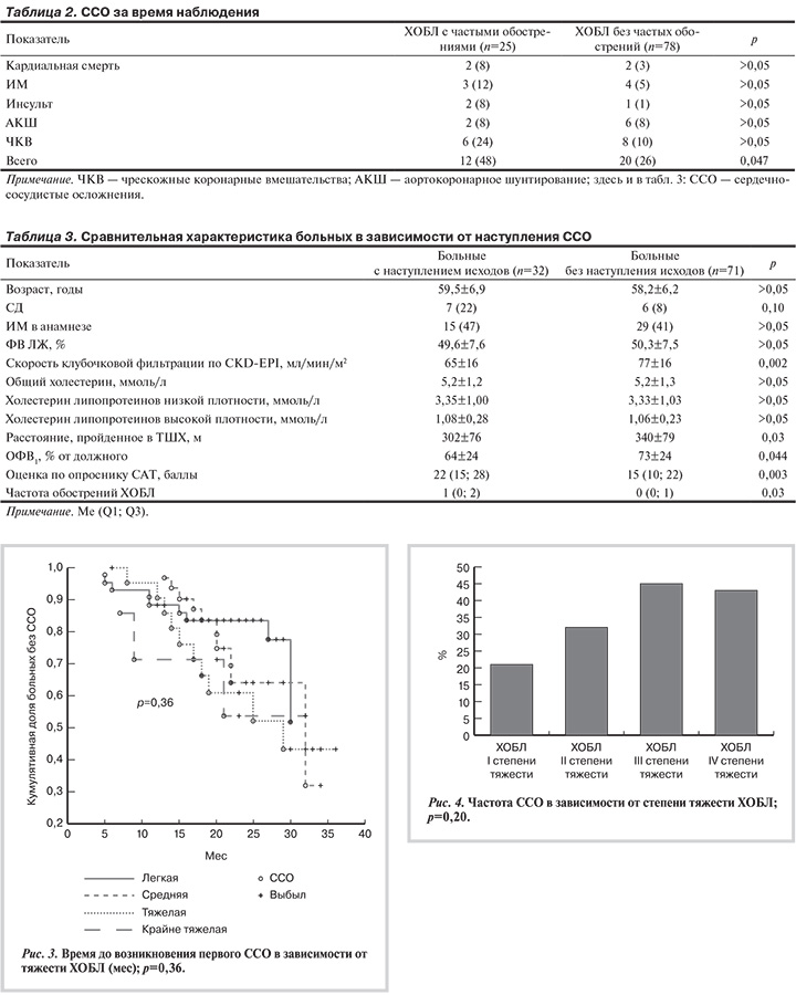 Наиболее сильная связь с развитием ССО обнаружена для расчетной скорости клубочковой фильтрации по формуле CKD-EPI и оценкой по опроснику CAT (p<0,01). Статистически значимая связь с развитием ССО обнаружена также для расстояния, пройденного при ТШХ, частоты обострений ХОБЛ и ОФВ1. В то же время не было связи между градациями степени тяжести ХОБЛ и частотой развития ССО. Более значимыми в отношении неблагоприятного прогноза ССЗ были такие переменные, как число обострений ХОБЛ и оценки по опроснику CAT — т.е. клинические характеристики ХОБЛ. Не было обнаружено связи между возрастом, ИМ в анамнезе, ФВ ЛЖ, уровнями общего холестерина и его фракций и развитием ССО. Отмечалась тенденция к преобладанию ССО среди больных, имеющих СД.