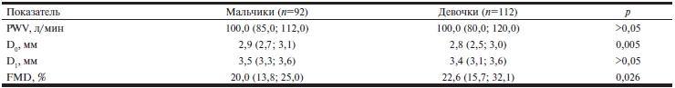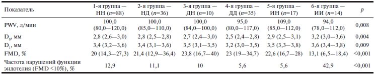 Примечание. Данные представлены в виде медианы (Ме) и интерквартильного размаха (25-й процентиль; 75-й процентиль). PWV — объемная скорость кровотока; здесь и в табл. 2: D0 — исходный диаметр плечевой артерии; D1 — диаметр плечевой артерии при реактивной гиперемии; FMD — опосредованная потоком дилатация плечевой артерии.