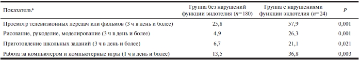 Анализ особенностей образа жизни детей с нарушениями и без нарушений функции эндотелия позволил выявить, что дети с нарушениями функции эндотелия более склонны к малоподвижному образу жизни (табл. 3). В частности, у них чаще, чем у детей без соответствующих нарушений, длительность таких видов деятельности, как просмотр телевизионных передач или фильмов, рисование, рукоделие, моделирование, а также приготовление школьных заданий составляла 3 ч в день и более. Работе за компьютером и компьютерным играм дети с нарушениями функции эндотелия чаще уделяли 1 ч и более ежедневно. Полученные результаты позволяют обсуждать связь особенностей образа жизни и функционального состояния сосудистой стенки у детей подросткового возраста. Известно, что малая двигательная активность, преобладание в распорядке дня малоподвижных видов деятельности способствуют развитию и прогрессированию атеросклеротического поражения сосудов [1—3]. Полученные нами результаты полностью согласуются с данным положением и позволяют сделать заключение о его справедливости в группе детей подросткового возраста.