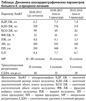 В результате серии интервенционных вмешательств отмечено существенное сокращение камер сердца, особенно правых, уменьшение степени регургитации на клапанах и легочной гипертензии (см. таблицу; см. рис. 2, б): Кроме того, на фоне длительной терапии амиодароном 200 мг/сут (с периодическим увеличением дозы до 400 мг/сут в связи с нарастанием желудочковой экстрасистолии) 12.02.14 отмечено восстановление синусового ритма, который сохраняется до настоящего времени (ноябрь 2014 г.); желудочковой экстрасистолии нет, сохраняется небольшое количество наджелудочковых экстрасистол. Данный факт рассматривается как весьма убедительное доказательство эффективности интервенционного лечения.