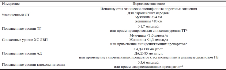 В новом интегральном определении МС используется структура, предложенная AHA/NHLBI с учетом этнически специфичных пороговых значений ОТ, рекомендованных IDF для оценки выраженности абдоминального ожирения. Однако не найдено компромисса между европейскими странами, которым предложено выработать свои национальные нормативы показателя ОТ для клинического применения (табл. 3).
