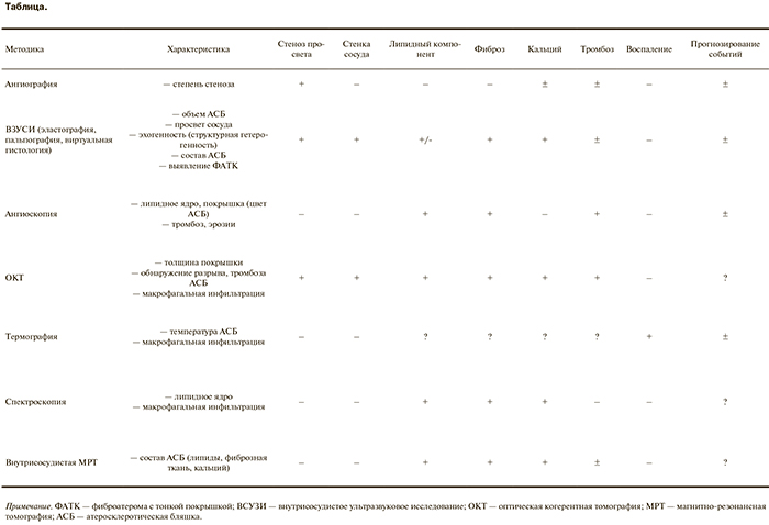 Термография. Известно, что нестабильные АСБ инфильтрированы воспалительными клетками, которые интенсивно потребляют глюкозу и кислород, выделяют тепло, что может вызвать локальное повышение температуры. Для термографии используются катетеры, способные определять повышение температуры в АСБ с активным воспалением. Разрешение метода — 0,02 °С, пространственное разрешение — 500 мкм. Ограничения метода: для точного измерения температурной неоднородности необходима временная окклюзия сосуда, расстояние от датчика до стенки сосуда должно быть <0,5 мм, что может травмировать стенку сосуда.