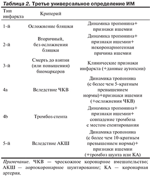 Третье универсальное определение ИМ. В настоящее время для постановки диагноза «ИМ» следует использовать так называемое третье универсальное определение, принятое Всемирной организацией здравоохранения, Европейским обществом кардиологов, Американской коллегией кардиологов и Американской ассоциацией сердца [2]. Суть данного определения — необходимость получения доказательства того, что имеется некроз миокарда и одновременно того, что этот некроз произошел вследствие его ишемии. Всего в рамках данного определения предложено выделить 6 типов ИМ — 3 спонтанных и 3 ятрогенных (табл. 2).
