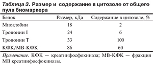 Кроме того, следует обращать внимание на кинетику выделения биомаркера из ткани, поскольку желательно иметь возможность определения срока и объема повреждения по динамике концентрации вещества. Кинетика выделения связана с размером молекулы и связью ее с внутриклеточными структурами. Чем меньше молекула и меньше связь, тем быстрее она появится в кровотоке после гибели клетки (табл. 3). При ОКС отсутствие одного «идеального» биомаркера может быть компенсировано использованием одновременного определения сразу нескольких веществ, имеющих различную кинетику выявления и кардиоспецифичность.