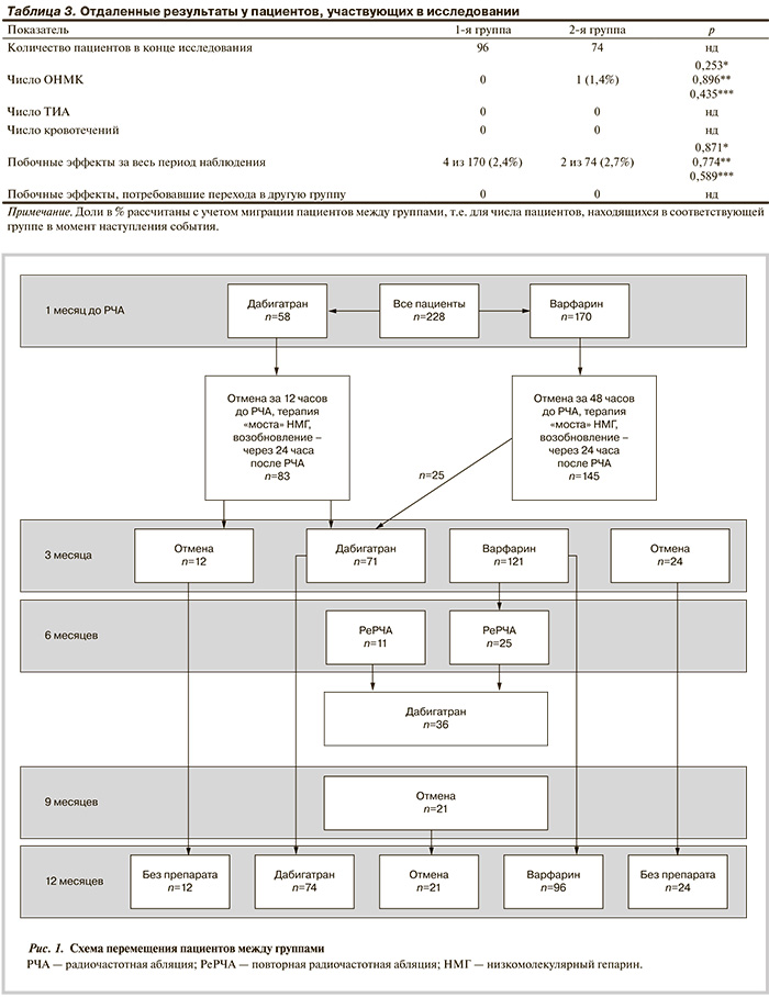Прием обоих препаратов начинался не позднее чем за 30 дней до вмешательства и продолжался не менее чем 90 дней после РЧА. В обеих группах применяли прерывистую схему гипокоагуляции с терапией «моста» эноксапарином. При этом варфарин отменяли за 24 ч до процедуры, дабигатран — за 12 ч, а возобновляли прием обоих препаратов через 24 ч после РЧА.