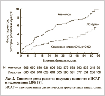 В исследовании LIFE с участием более 9000 больных АГ в возрасте 55—80 лет с электрокардиографическими признаками гипертрофии ЛЖ терапия, основанная на антагонисте рецепторов ангиотензина II лозартане (оригинальный лозартан козаар, Мерк Шарп и Доум Б.В.), превзошла режим, основанный на β-адреноблокаторе атенололе, в отношении снижения риска развития сердечно-сосудистых осложнений, особенно инсульта, при этом у пациентов с ИСАГ эти различия были наиболее отчетливы (рис. 2). У больных ИСАГ терапия, основанная на лозартане, сопровождалась снижением риска развития любого инсульта на 40% (p=0,02), смертельного инсульта на 70% (p=0,035), атеротромботического на 45% (p=0,022) и эмболического на 36% (p=0,33) [8].