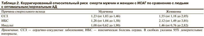 То, что ИСАГ — отнюдь не «безобидное» состояние у людей молодого и среднего возраста, подтверждают результаты Чикагского исследования [14]. За 31 год наблюдения было зарегистрировано 1728 смертей в связи ССЗ, 1168 смертей от ИБС и 223 смерти от инсульта. Корригированные относительные риски смерти пациентов с ИСАГ от перечисленных причин представлены в табл. 2. Следует отметить, что наличие ИСАГ повышло риск смерти от ИБС, но не от инсульта, а риск любого смертельного исхода был у женщин выше.
