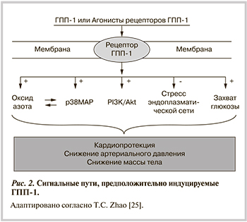 ИМ и СН характеризуются инсулинрезистентным состоянием. Предпочтительным энергетическим субстратом для поврежденного миокарда с точки зрения кардиопротекции является глюкоза, так как позволяет восстановить адекватное поступление энергии и миокардиальный кровоток. При остром ИМ использование глюкозо-калиево-инсулиновой смеси является адъювантной терапией, однако требует проведения постоянной инфузии и сопряжено с риском развития гипогликемии. В настоящее время получены данные экспериментальных и клинических исследований, подтверждающие возможность использования агонистов ГПП-1 в качестве кардиопротективного препарата. Установлено, что ГПП-1 оказывает сопоставимое с инсулином улучшение захвата глюкозы, но использует иные клеточные пути — р38-митоген-активируемой протеинкиназы, фосфоинозитол-3-киназы и NO (рис. 2). На фоне введения агонистов ГПП-1 у пациентов, перенесших острый ИМ и чрескожную коронарную ангиопластику, подтверждено улучшение функции миокарда.