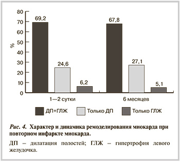 При анализе результатов ЭхоКГ в 1—2-е сутки ИМ и в динамике через 6 мес от начала заболевания получены следующие данные. В острый период, как при первичном, так и при повторном ИМ у большинства больных выявлены изменения основных ультразвуковых параметров миокарда: дилатация полостей (ДП) и гипертрофия левого желудочка (ГЛЖ) (рис. 2).