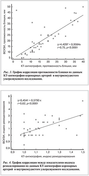 Полученные при компьютерной томографии характеристики атеросклеротических бляшек хорошо коррелируют с показателями внутрисосудистого ультразвукового исследования, в том числе при оценке одного из наиболее важных признаков нестабильности атеросклеротической бляшки — положительного ремоделирования артерии на уровне бляшки.