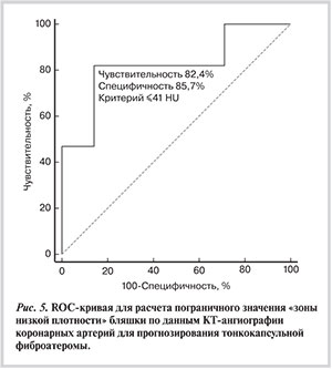 Наиболее значимым КТ-критерием нестабильности АСБ, косвенно указывающим на большое липидное ядро в ее структуре, считается наличие «зоны низкой плотности». В проспективном исследовании S. Motoyama и соавт. [30] выявление этого показателя наряду с положительным ремоделированием артерии указывало на высокую вероятность развития ОКС. В нашей работе с помощью ROC-анализа мы определили, что наличие в АСБ участка плотностью ≤41 HU является достоверным КТ-критерием ФАТК.