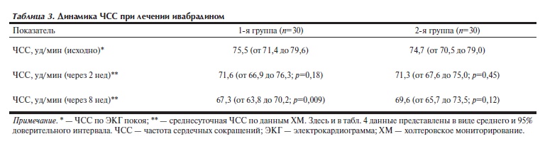 Таблица 3. Динамика ЧСС при лечении ивабрадином.