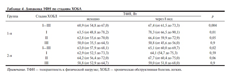 При изучении уровня переносимости физических нагрузок было обнаружено повышение ТФН в зависимости от стадии ХОБЛ. Так, в 1-й группе повышение ТФН выявлено у больных ХОБЛ I и II стадии (табл. 4). Во 2-й группе достоверного повышения ТФН не выявлено, однако у больных ХОБЛ II стадии также отмечено увеличение ТФН. У больных ХОБЛ III стадии в обеих группах изменений уровня ТФН выявлено не было. Учитывая более высокую физическую активность больных ХОБЛ I и II стадии, можно предположить высокую значимость полученных результатов именно для этих пациентов.