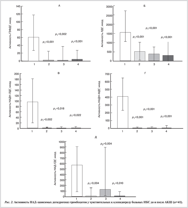 У чувствительных к клопидогрелу больных ИБС до операции в тромбоцитах снижена активность Г3ФДГ (рис. 2, А), ЛДГ (рис. 2, Б), НАДН-ЛДГ (рис. 2, В) и НАДН-МДГ (рис. 2, Г). Уровни активности данных ферментов остаются пониженными как через 2 нед, так и через 6 мес после АКШ. В то же время пониженная до операции активность НАД-ГДГ через 2 нед после АКШ повышается до контрольной, но через 6 мес снова снижается до исходной (рис. 2, Д).