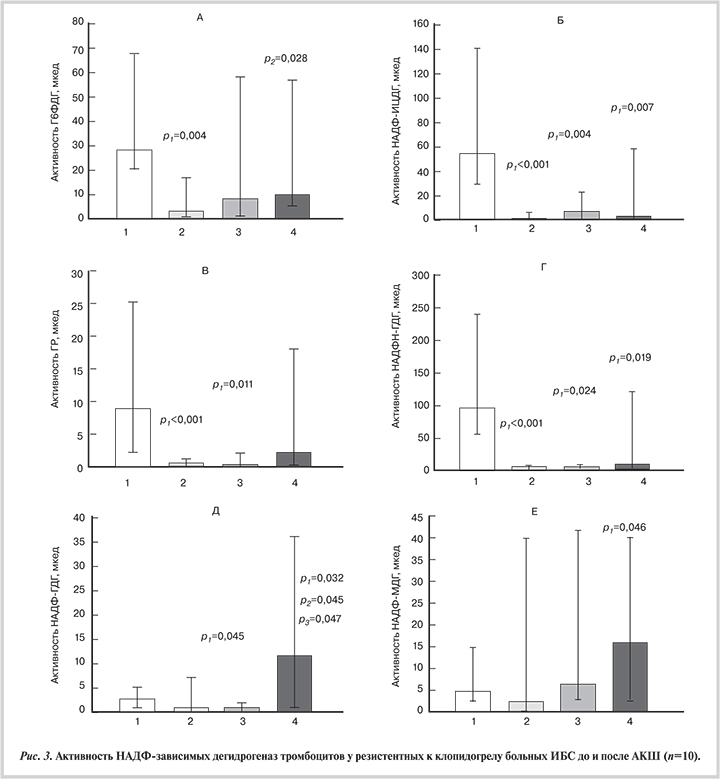 При исследовании уровней активности НАДФ-зависимых дегидрогеназ тромбоцитов обнаружено, что у чувствительных к клопидогрелу больных ИБС повышается активность НАДФ-МДГ (рис. 1, А) и снижаются уровни ГР (рис. 1, Б) и НАДФН-ГДГ (рис. 1, В). При этом активность НАДФ-МДГ в тромбоцитах остается повышенной через 2 нед и 6 мес после АКШ. Активность ГР и НАДФН-ГДГ также остается пониженной в этот же период после операции. Через 2 нед после АКШ у больных ИБС снижается активность НАДФ-ИЦДГ и остается пониженной через 6 мес после операции (рис. 1, Г).