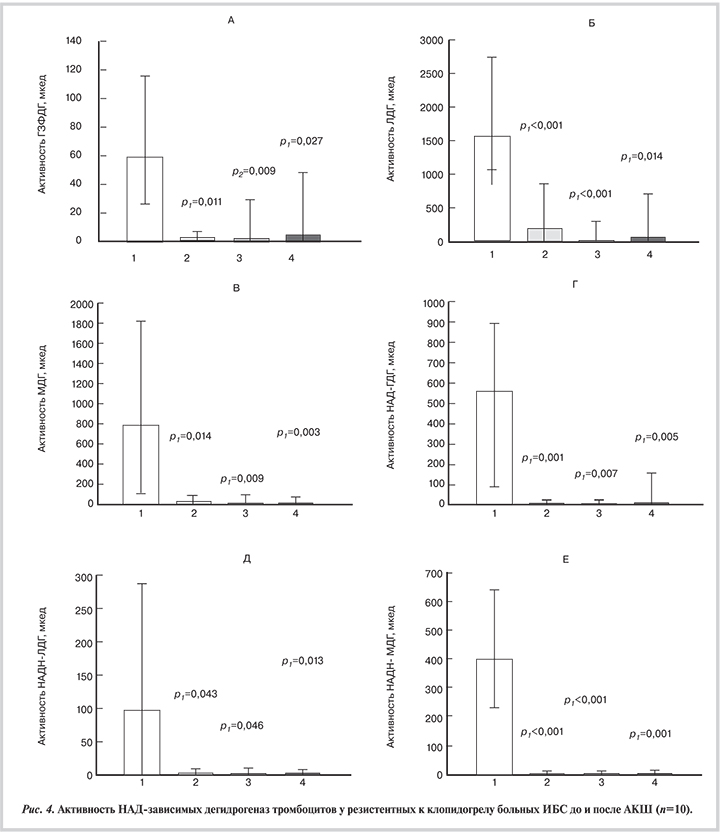 У резистентных к клопидогрелу больных ИБС до операции и на всем протяжении наблюдения после АКШ снижена активность Г3ФДГ (рис. 4, А), ЛДГ (рис. 4, Б), МДГ (рис. 4, В), НАД-ГДГ (рис. 4, Г), НАДН-ЛДГ (рис. 4, Д) и НАДН-МДГ (рис. 4, Е). Активность НАДН-ГДГ-3 8,01 (2,28; 24,51) мкед у больных данной категории до операции ниже (р=0,025), чем у лиц контрольной группы, — 84,71 (27,22; 150,55) мкед. Через 2 нед после АКШ активность НАДН-ГДГ также остается пониженной — 5,51 (2,02; 8,48) мкед, но повышается до контрольного диапазона через 6 мес — 61,23 (15,48; 132,22) мкед.