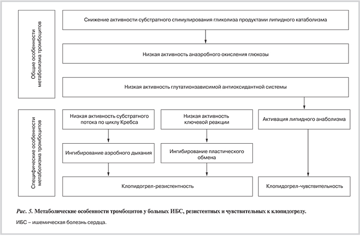 Таким образом, метаболизм тромбоцитов больных ИБС независимо от чувствительности к клопидогрелу характеризуется снижением активности анаэробной энергетики, глутатионзависимой антиоксидантной системы, а также реакций, осуществляющих перенос продуктов липидного катаболизма на гликолиз и НАДФН-зависимый отток субстратов с лимонного цикла на аминокислотный обмен (рис. 5). Метаболическими механизмами тромбоцитов, характеризующими состояние резистентности к клопидогрелу, являются низкая активность ключевой реакции пентозофосфатного цикла, отражающей состояние пластического обмена и субстратного потока по циклу трикарбоновых кислот, определяющего интенсивность аэробной энергетики. Только у чувствительных к клопидогрелу больных ИБС в тромбоцитах повышается активность НАДФ-МДГ (ключевой реакции липидного анаболизма). Не исключено, что отличия в метаболизме тромбоцитов у больных ИБС являются генетически детерминированными и могут быть одной из причин измененной реактивности тромбоцитов. Именно у больных этой категории с измененным метаболическим статусом не удается преодолеть на фоне терапии клопидогрелом высокую реактивность тромбоцитов. Установление метаболических особенностей тромбоцитов у больных с высокой остаточной реактивностью на клопидогреле позволяет продолжить поиск оптимальных лекарственных воздействий как на рецепторный аппарат клетки, так и на метаболизм тромбоцитов.