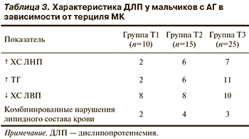 ДЛП в целом по группе выявлена у 20% подростков с достоверным преобладанием в группе мальчиков с гиперурикемией по сравнению с группой детей с СКМК в пределах нижнего терциля (р=0,009). Наиболее частой находкой было снижение уровней ХС ЛВП в сыворотке крови (52%), которое у 19 детей было изолированным, у 5 сочеталось с повышенным уровнем ХС ЛНП, у 1 — с повышенным уровнем ТГ, у 1 мальчика гипоальфахолестеролемия сочеталась с повышением уровней ЛНП и ТГ. У 30% подростков ДЛП характеризовалась изолированным повышением в сыворотке уровня ТГ, у 2 детей оно сочеталось с повышением ХС ЛНП. Изолированное повышение уровня ХС ЛНП выявлено у 14% детей. Достоверных различий по структуре ДЛП между группами детей с разным уровнем МК не обнаружено (табл. 3).