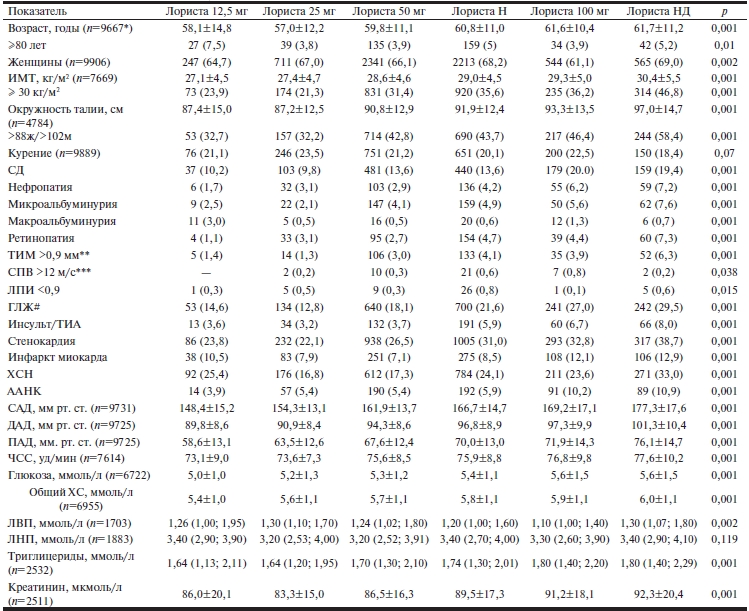 Клинико-анамнестическая характеристика больных, которым были назначены разные дозы лозартана или его комбинации с ГХТ представлены в табл. 1. Практически все из изученных в исследовании показателей были связаны с назначением разных доз исследуемых препаратов (кроме курения и уровня холестерина липопротеинов низкой плотности). Однако при многофакторном анализе выявлено, что выбор дозы лозартана определялся, главным образом (на 85% согласно оценке дисперсии, объясненной многофакторной моделью), исходным уровнем САД. В меньшей степени эти различия в выбранной тактике лечения объяснялись (далее признаки перечислены в порядке убывания значимости) исходным уровнем ДАД, наличием ХСН, возрастом, наличием СД, атеросклерозом артерий нижних конечностей, полом (женщинам назначали более высокие дозы), указанием в анамнезе на перенесенный инсульт.