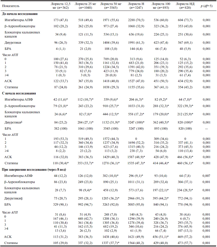 По истечении 8 нед терапия больных изменилась незначительно. Отмечено небольшое увеличение числа больных, применявших ингибиторы АПФ (+1—3% больных, получавших препараты лориста 50 мг или лориста Н), блокаторы кальциевых каналов (+2—3% больных, получавших препараты лориста 25 мг, 100 мг и лориста НД) и диуретики (+3—4% больных, получавших препараты лориста 50 и 100 мг) (см. табл. 2). Снижение частоты применения диуретиков в группах лориста Н и НД произошло за счет прекращения приема указанных препаратов или их замены на монопрепарат лозартана.