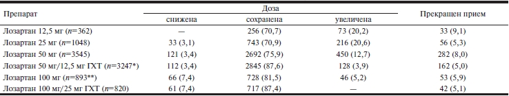 Примечание. Переход на прием лозартана в дозе 100 мг у 28 больных (*) и лозартана 50 мг/12,5 мг ГХТ у 56 больных (**) расценивали как сохранение дозы.